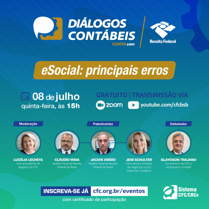 Para discutir o assunto, estarão presentes os auditores fiscais da RFB, Cláudio Maia e Jacian Anísio; a consultora e analista de negócios na SCI Sistemas Contábeis, Jení Schulter; e Glaydson Trajano, conselheiro do CFC e empresário contábil. A conversa será moderada por Lucélia Lecheta, contadora e vice-presidente de Registro do CFC.