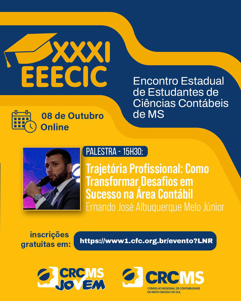 A realização integra a programação do “XXXI EEECIC – Encontro Estadual de Estudantes de Ciências Contábeis” que o CRCMS – Conselho Regional de Contabilidade do Mato Grosso do Sul e Comissão de Jovens Lideranças Contábeis de MS – CRCMS Jovem realizarão no próximo dia 08/10/2025, das 14h às 17h com o tema “Construindo Caminhos: Competências Técnicas e Emocionais para o Sucesso Contábil”.