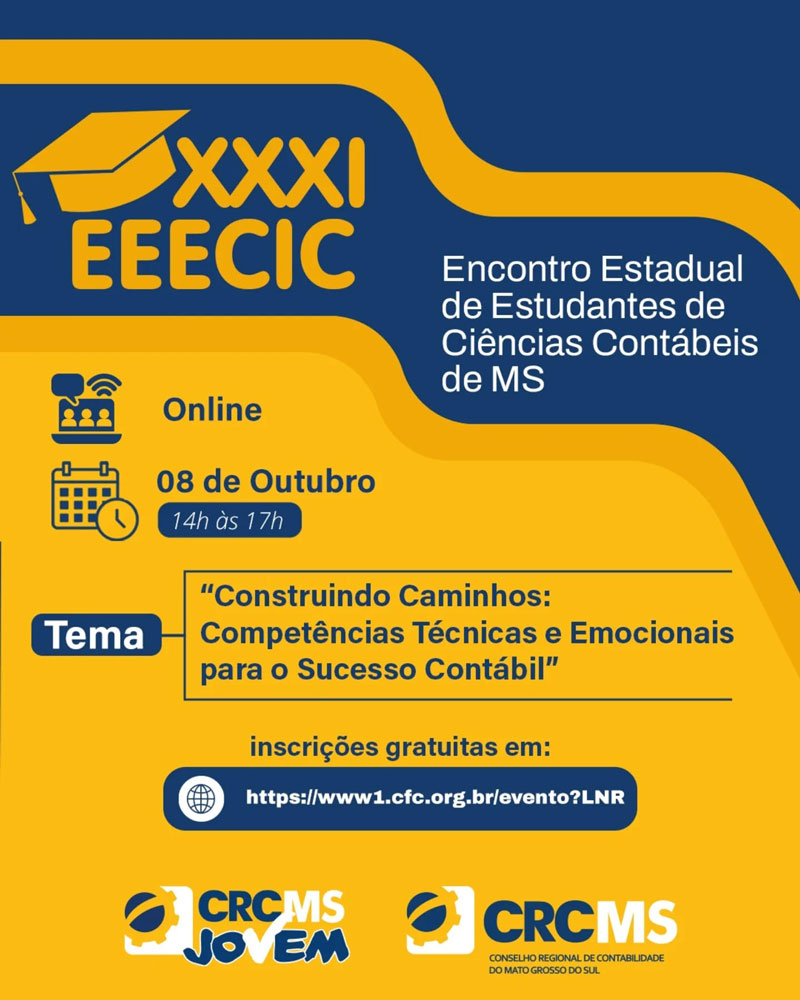Com o tema “Construindo Caminhos: Competências Técnicas e Emocionais para o Sucesso Contábil”, o CRCMS – Conselho Regional de Contabilidade do Mato Grosso do Sul e a Comissão de Jovens Lideranças Contábeis de MS – CRCMS Jovem realizarão o “XXXI EEECIC – Encontro Estadual de Estudantes de Ciências Contábeis”.