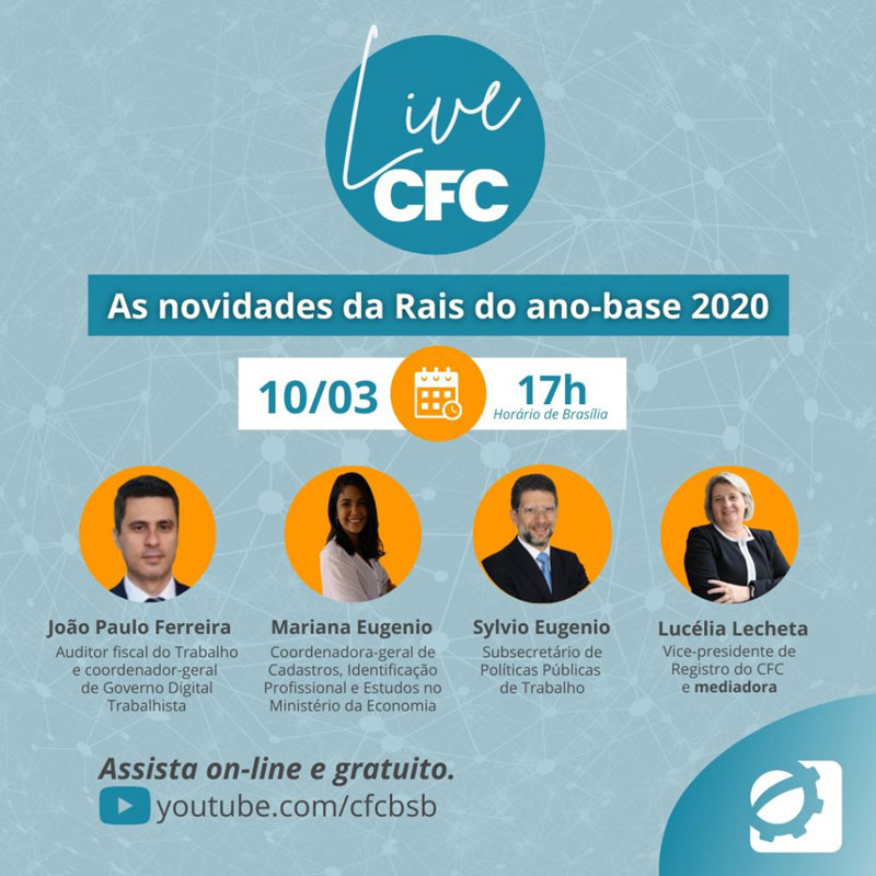 A abertura do prazo para a entrega da Relação Anual de Informações Sociais (RAIS) de 2020 começa no próximo sábado (13). Para auxiliar os Profissionais da Contabilidade e todos aqueles que estão obrigados a entregar o documento, o Conselho Federal de Contabilidade (CFC) realiza, na próxima quarta-feira (10), às 17h, a live “As novidades da Rais do ano-base 2020”. O encontro virtual será transmitido pelo canal do CFC no YouTube.