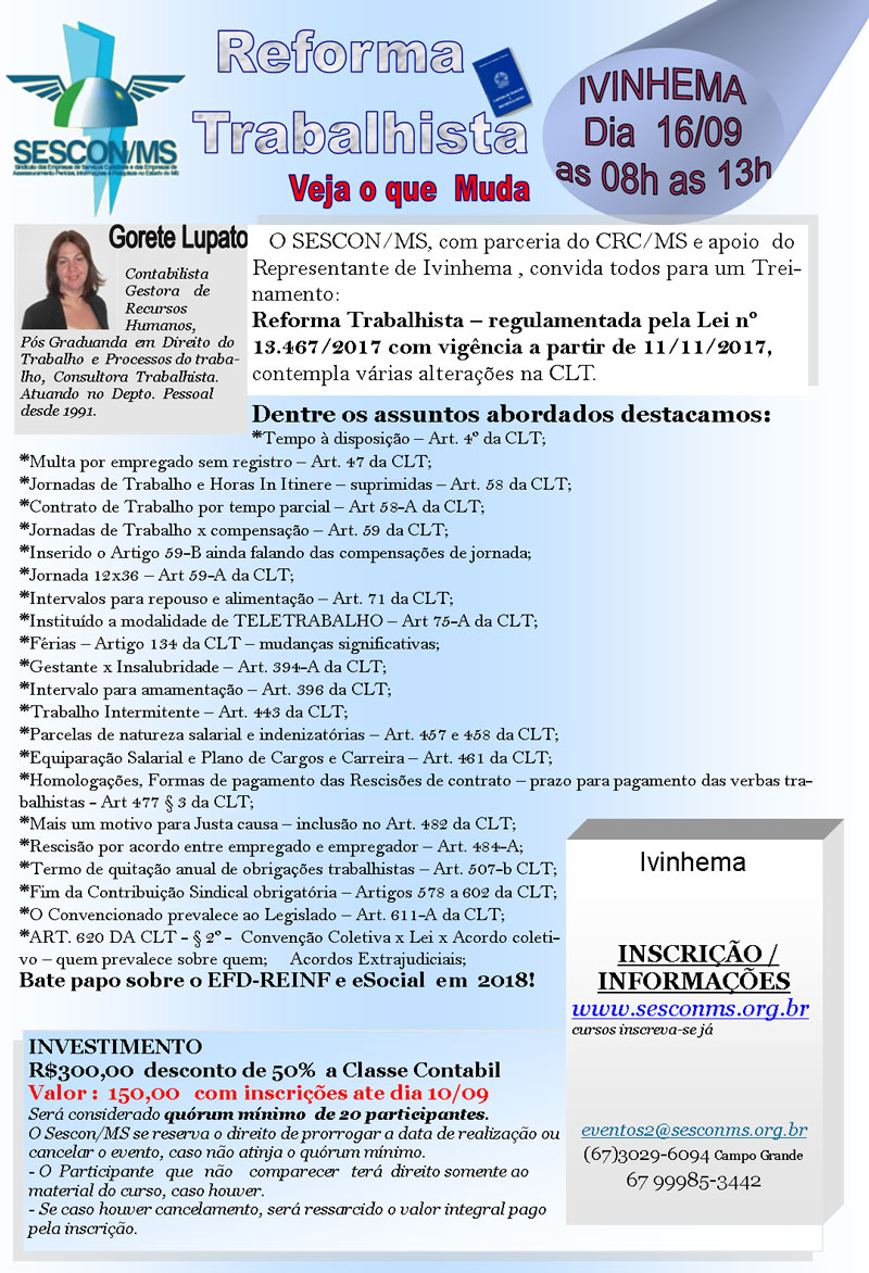 16/09 - Treinamento “Reforma Trabalhista” em Ivinhema