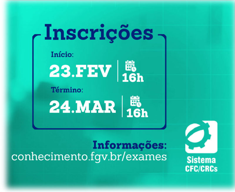 As inscrições para a 1ª Edição do Exame de Suficiência 2026 começam no dia 23/02 (a partir das 16h) e seguem até às 16h do dia 24/03/26 (horário oficial de Brasília) e devem ser efetuadas pelo site da Fundação Getúlio Vargas – FGV, banca organizadora do certame: https://conhecimento.fgv.br/exames/cfc-exame-de-suficiencia.