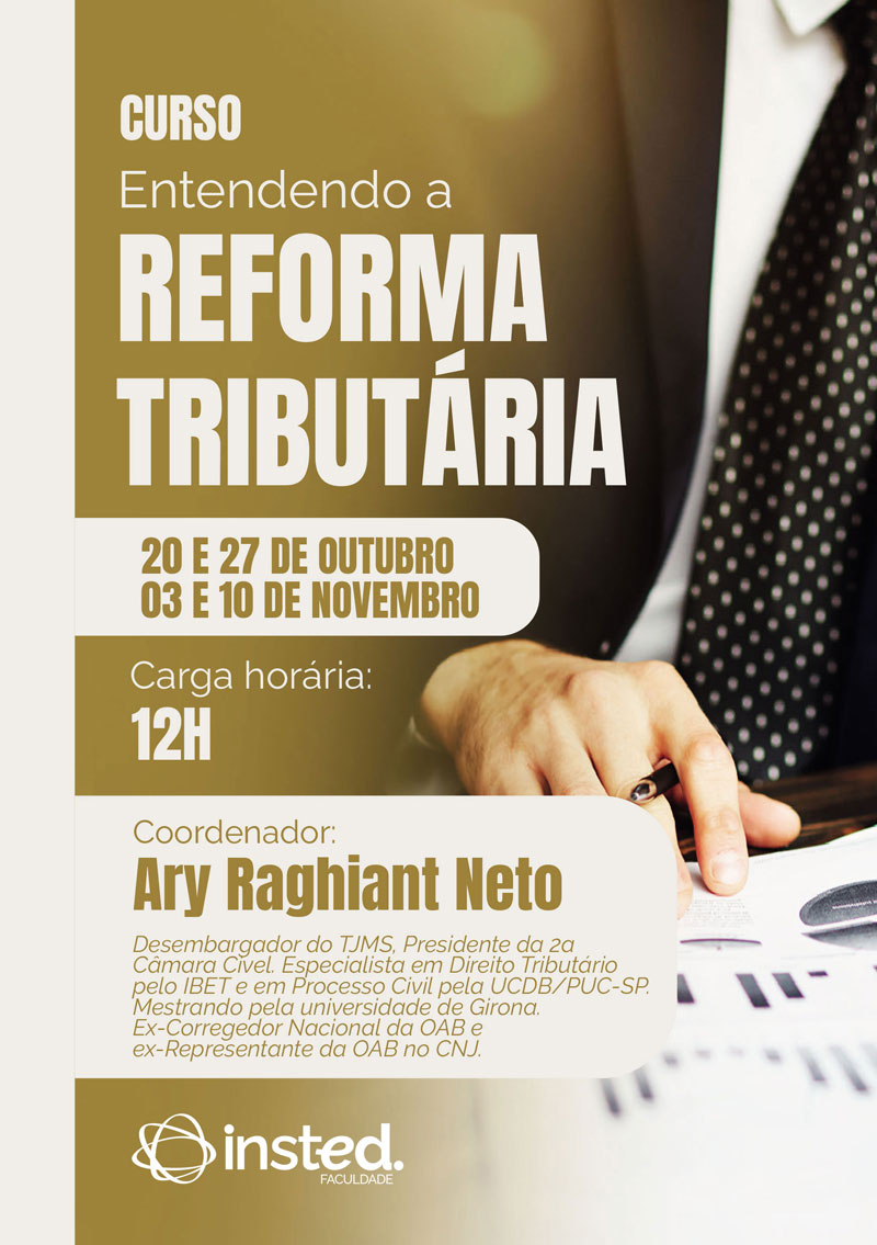 O CRCMS informa que a Faculdade Insted está com inscrições abertas para o Curso “Entendendo a Reforma Tributária”, a ser realizado nos dias 20 e 27/10 e 03 e 10/11/2025, com carga horária de 12 horas, em formato hibrido, presencial e on-line.