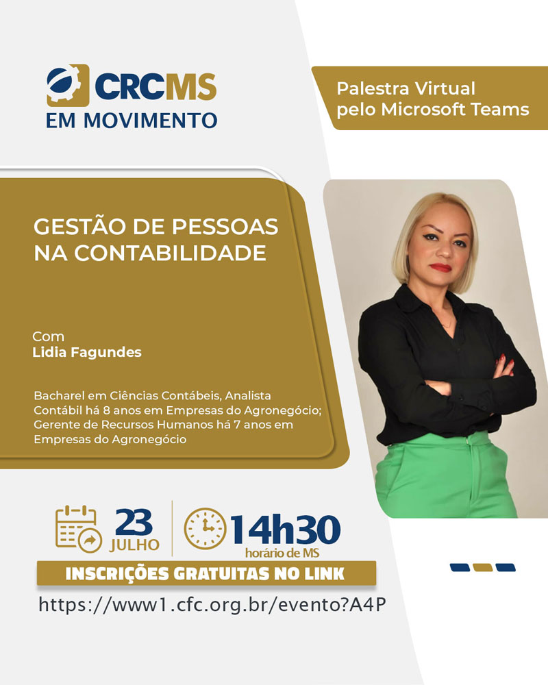 O CRCMS – Conselho Regional de Contabilidade do MS através do Projeto “CRCMS em Movimento – Ciclo de Palestras” realizará a Palestra “Gestão de Pessoas na Contabilidade” no dia 23/07/25, quarta-feira, às 14h30h(MS), online, através da Plataforma Microsoft Teams.