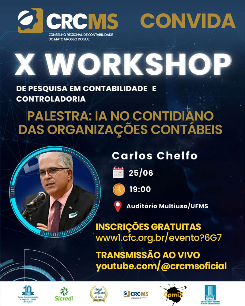 O CRCMS – Conselho Regional de Contabilidade do MS convida os Profissionais da Contabilidade, Empresários Contábeis e Acadêmicos de Ciências Contábeis para o “X Workshop de Pesquisas em Contabilidade e Controladoria/Palestra Impacto da Inteligência Artificial na Contabilidade”.