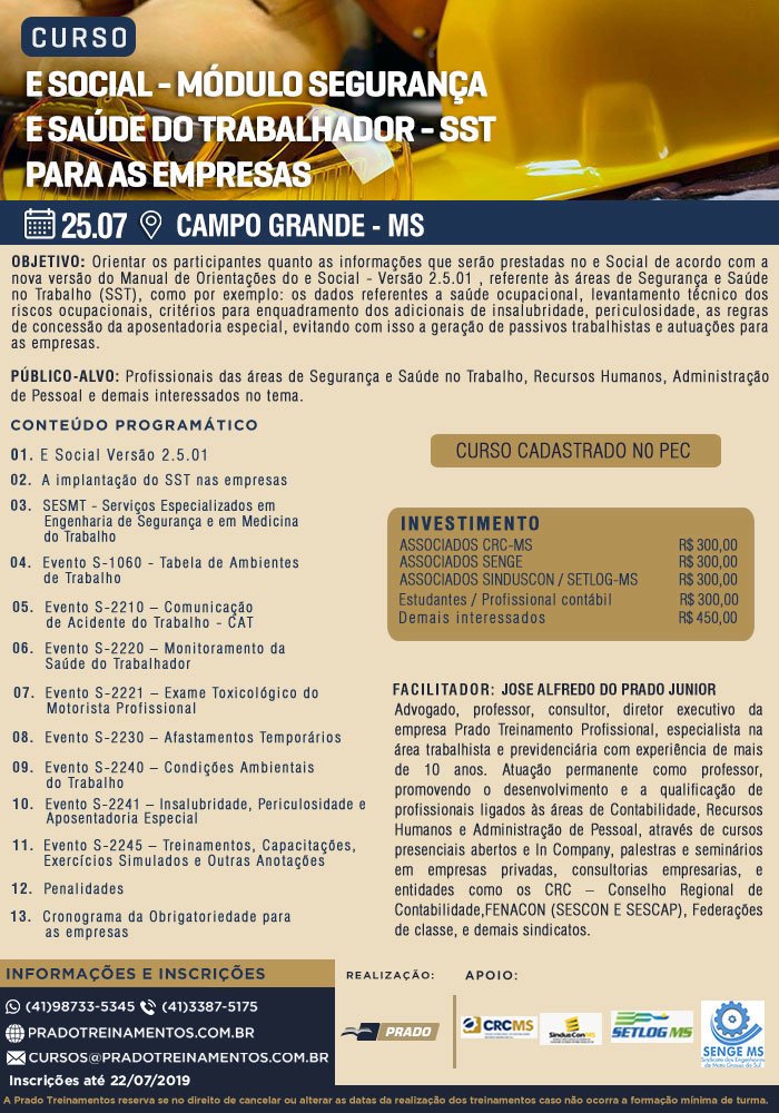 25/07, em Campo Grande: Curso eSocial – Módulo Segurança e Saúde do Trabalhador – SST para as Empresas