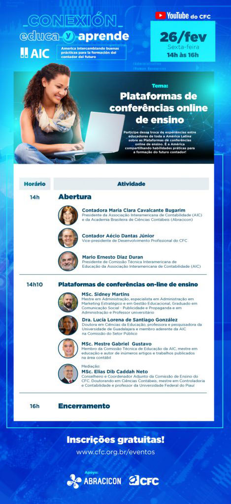 A Associação Interamericana de Contabilidade (AIC), com o apoio do Conselho Federal de Contabilidade (CFC) e da Academia Brasileira de Ciências Contáveis (ABRACICON), realizará no dia 26 de fevereiro (sexta-feira) mais uma edição do projeto “Conexión educa y aprende – América intercambiando buenas prácticas para la formación del contador del futuro”, com o tema “Plataformas de conferências on-line de ensino”.
