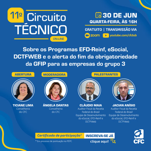 #CFCEvento: Participe do 11º Circuito Técnico do CFC e fique por dentro dos programas EFD-Reinf, e-Social e DCTFWEB.