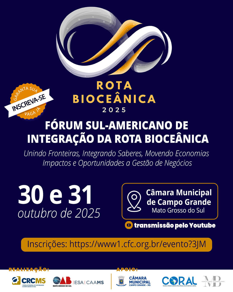Com o tema “Unindo Fronteiras, Integrando Saberes, Movendo Economias Impactos e Oportunidades a Gestão de Negócios”, o CRCMS – Conselho Regional de Contabilidade do Mato Grosso do Sul e a OAB – Ordem dos Advogados do Brasil/MS com o apoio da ESA, CAAMS, CMCG – Câmara Municipal de Campo Grande/MS, do CORAL – Centro Observatório das Rotas da América Latina e da MB – Consultoria Internacional realizarão o “Fórum Sul-Americano de Integração da Rota Bioceânica” nos dias 30 e 31/10/2025.