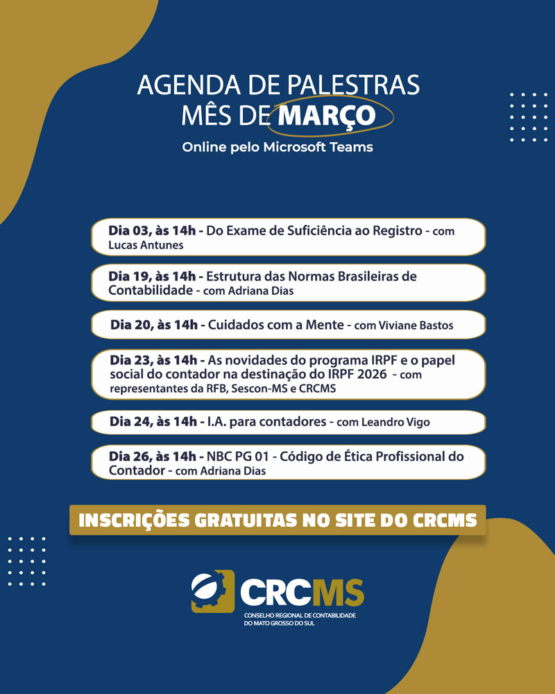 * 19/03/26, às 14h(MS): Palestra “Estrutura das Normas Brasileiras de Contabilidade” com a Contadora e Conselheira do CRCMS, Adriana Dias.