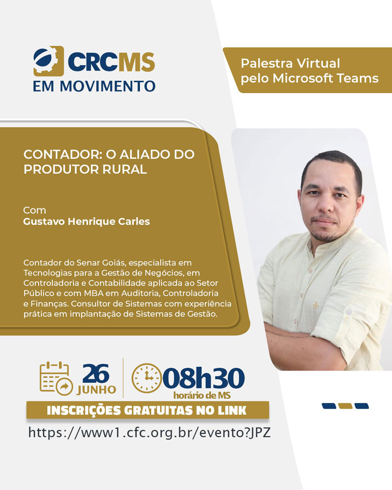 O Projeto “CRCMS em Movimento – Ciclo de Palestras” realizará a Palestra “Contador: O Aliado do Produtor Rural”, dia 26/06/25, quinta-feira, online, através da Plataforma Microsoft Teams, com início às 8h30(MS).