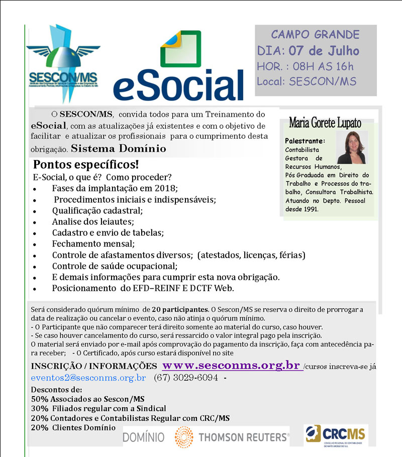 Campo Grande – 07/07: Curso “eSocial: Implantação! O que é, Como Implantar? Procedimentos Iniciais e Indispensáveis”