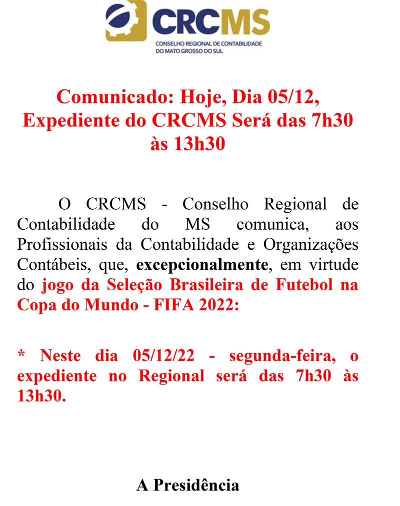 O CRCMS – Conselho Regional de Contabilidade do MS comunica, aos Profissionais da Contabilidade e Organizações Contábeis, que, excepcionalmente, em virtude do jogo da Seleção Brasileira de Futebol na Copa do Mundo – FIFA 2022Neste dia 05/12/22 – segunda-feira, o expediente no Regional será das 7h30 às 13h30.