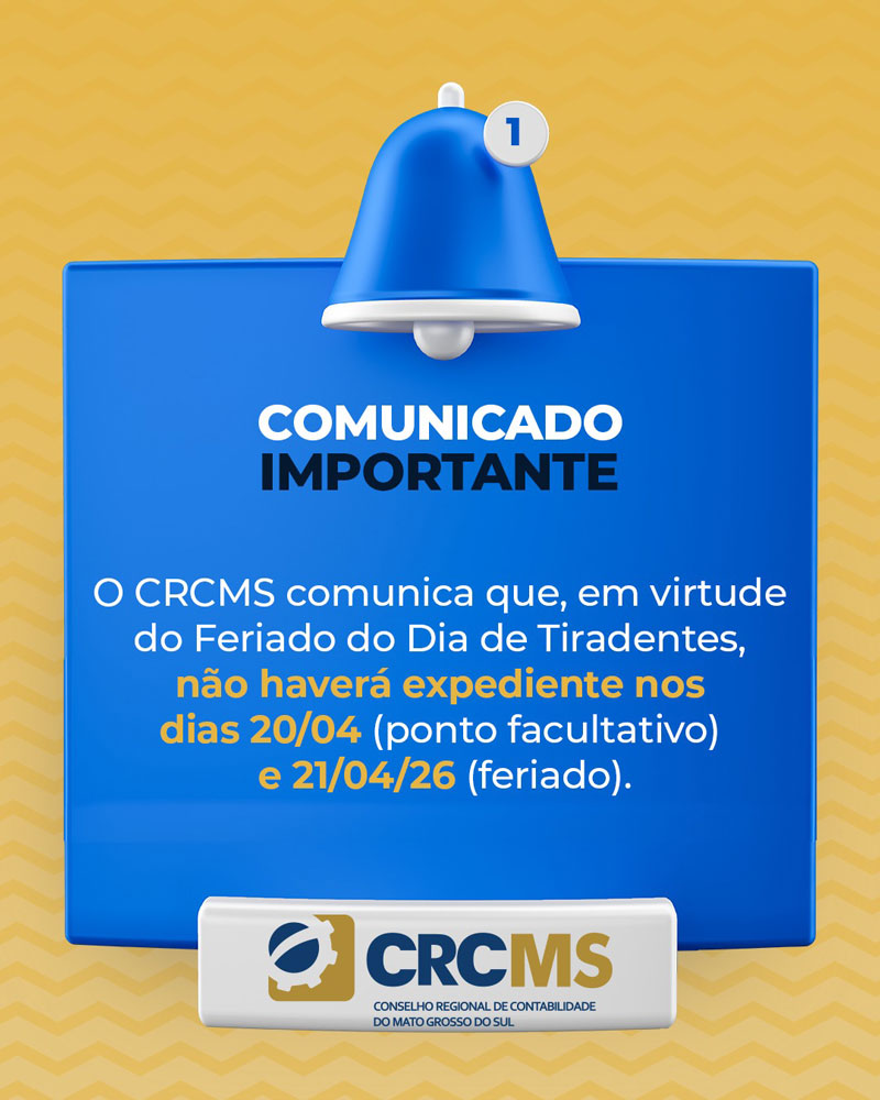 O CRCMS – Conselho Regional de Contabilidade do MS comunica que, em virtude do Feriado do “Dia de Tiradentes”, não haverá expediente no Regional nos dias 20/04(Ponto Facultativo) e 21/04/26(Feriado Nacional).