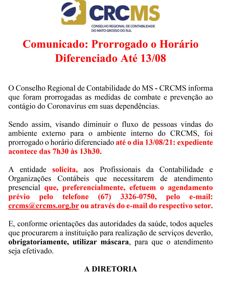 Comunicado: Prorrogado o Horário Diferenciado Até 13/08