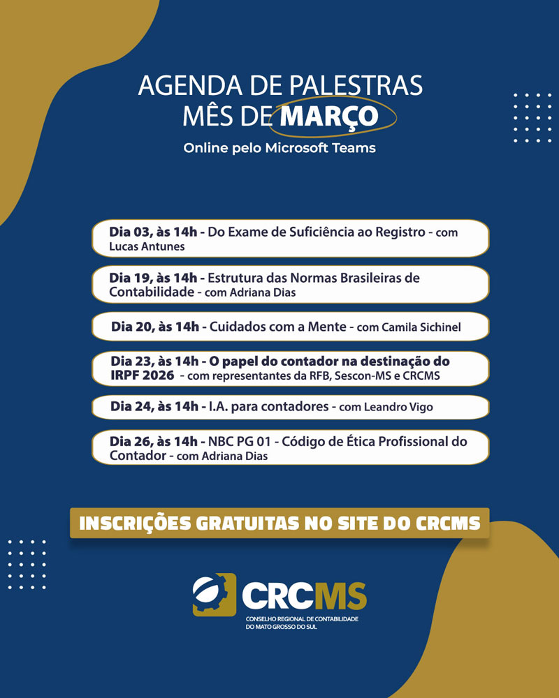 * 19/03/26, às 14h(MS): Palestra “Estrutura das Normas Brasileiras de Contabilidade” com a Contadora e Conselheira do CRCMS, Adriana Dias. Mediação: Conselheiras da Câmara de Desenvolvimento Profissional do CRCMS. Inscrições em: https://www1.cfc.org.br/evento?QE7