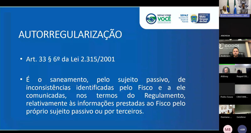 Proferida pelo Superintendente de Administração Tributária do Estado de MS, Bruno Gouvêa Bastos e pela Coordenadora de Planejamento e Controle Fiscal, Sabrina Melo, visou prestar esclarecimento, passar orientações e esclarece dúvidas dos participantes sobre o Programa “Regularize Já”, a nova ferramenta de autorregularização tributária que permite aos empresários corrigirem pendências fiscais antes da aplicação de multas, instituído por meio da Resolução nº 3.489, publicada no Diário Oficial do Estado de 03/02/26.
