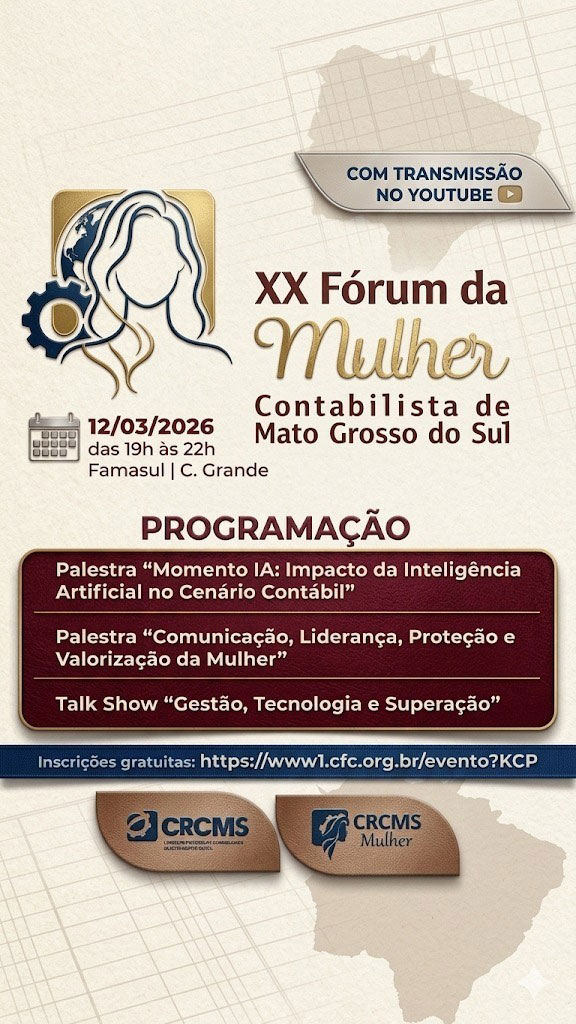 Com o tema: “Conectando Futuros: IA, Empreendedorismo e a Proteção à Mulher”, o “XX Fórum da Mulher Contabilista de Mato Grosso do Sul” será realizado, hoje, dia 12/03/26, da 19h às 22h, no formato híbrido, presencial – no Auditório da FAMASUL, Rua Marcino dos Santos, 401, Chácara Cachoeira, em Campo Grande/MS, e, online, com retransmissão para as cidades do interior do Estado.