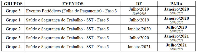A citada portaria alterou (também por 6 meses) o prazo de entrega dos eventos de Saúde e Segurança do Trabalho (SST) para todos os grupos.