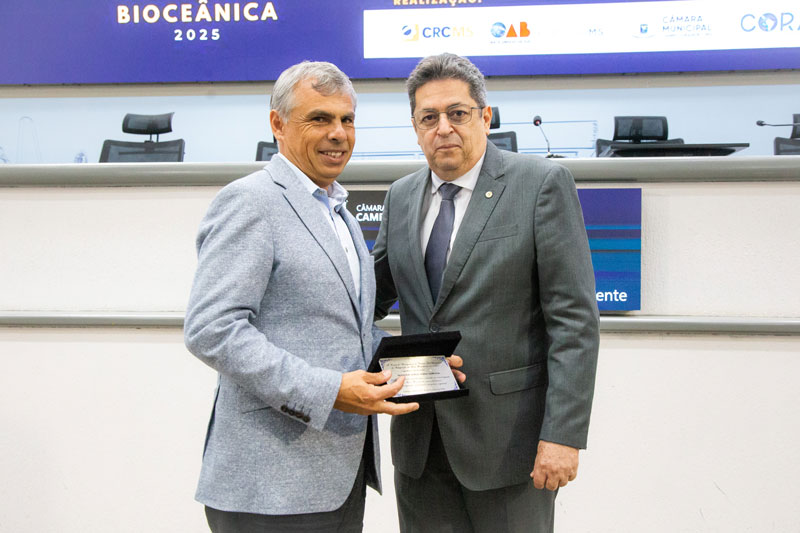 O “Fórum Sul-Americano de Integração da Rota Bioceânica” realizado nos dias 30 e 31/10/25 pelo CRCMS – Conselho Regional de Contabilidade do Mato Grosso do Sul em parceria com a OAB – Ordem dos Advogados do Brasil/MS e apoio da ESA, CAAMS, CMCG – Câmara Municipal de Campo Grande/MS, CORAL – Centro Observatório das Rotas da América Latina e MB – Consultoria Internacional homenageou personalidades ilustres.