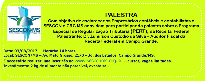 Hoje, Dia 03/08 às 14h em Campo Grande: Palestra “Programa Especial de Regularização Tributária (PERT)”