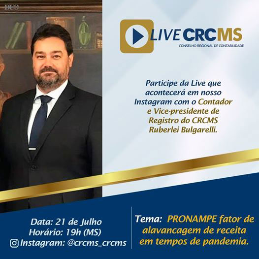 Será no dia 21/07/20, terça-feira, às 19h (Horário de MS), com o Empresário Contábil, Ex-Presidente do CRCMS e atual Vice-Presidente de Registro do Regional, Contador Ruberlei Bulgarelli, no canal do CRCMS no Instagram: @crcms_crcms.