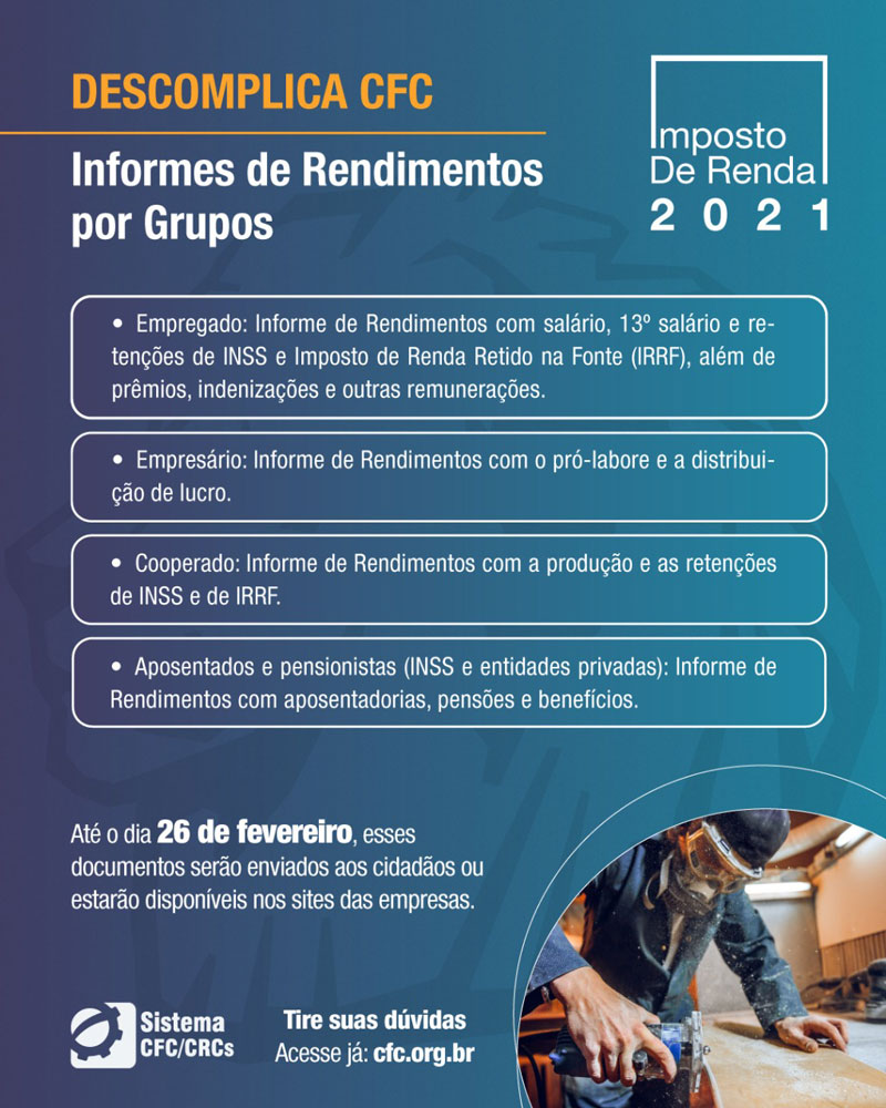 Atenção! O contribuinte precisa ficar atento às comunicações feitas por bancos, corretoras de ações e outras instituições financeiras, que devem disponibilizar os Informes de Rendimentos Financeiros. Esses dados também serão necessários para a declaração do imposto de renda. Aqueles que estiverem obrigados a entregar a declaração também devem buscar os seguintes informes de rendimentos, de acordo com o grupo que faz parte. Não deixe para a última hora.