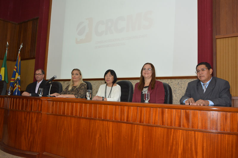 Compuseram a Mesa de Autoridades a Presidente do CRC/MS, Iara Sonia Marchioretto; a Vice-Presidente de Administração do CRC/MS, Maria Leny Adania de Sylos; a Conselheira Efetiva Eloir Trindade Vasques Vieira; o Membro da Comissão Jovem Lideranças Contábeis de MS, Reinaldo Oliveira e o Conselheiro Efetivo e Ex-Presidente do CRC/MS, Alcyr Moreira Fernandes.