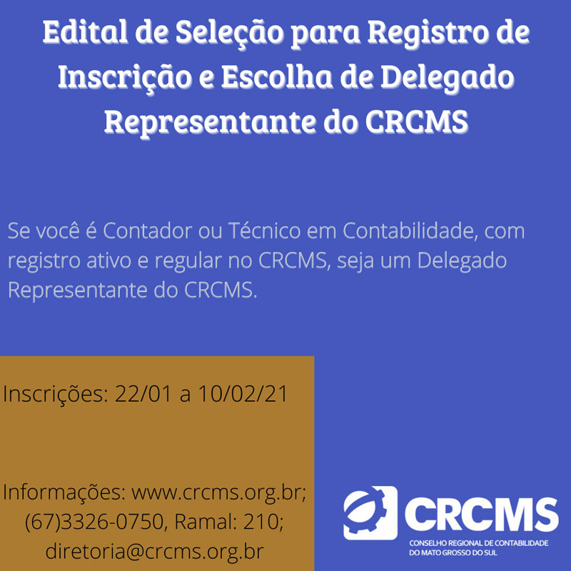 O CRCMS – Conselho Regional de Contabilidade de Mato Grosso do Sul informa que termina nesta quarta-feira, dia 10/02/21, o período para os Profissionais da Contabilidade interessados efetuarem a inscrição para a função honorífica de Delegado Representante do CRCMS.