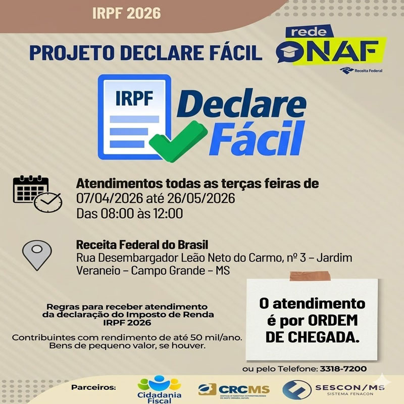 Todas as terças-feiras, até 26/05, das 8h às 12h, no prédio da Receita Federal, em Campo Grande/MS.