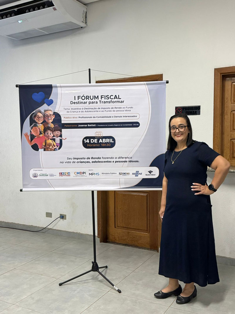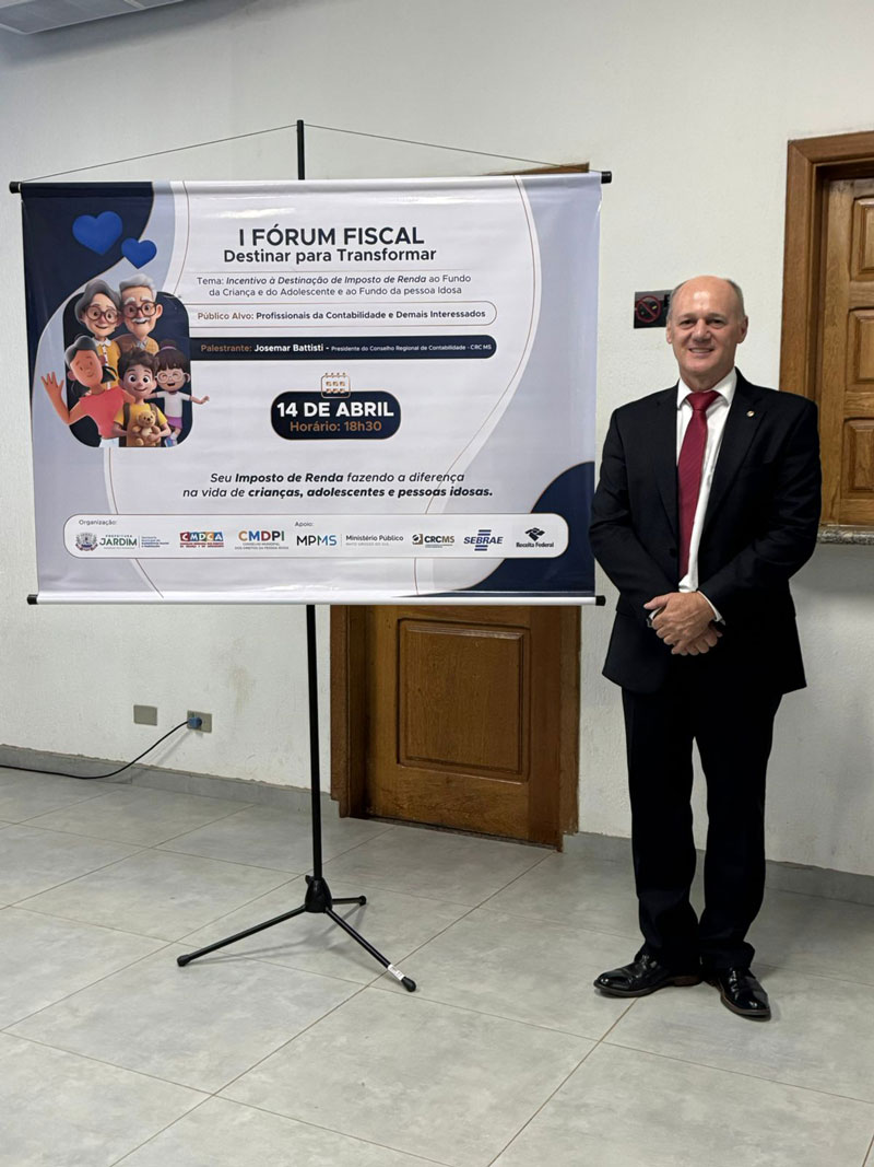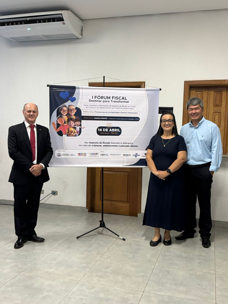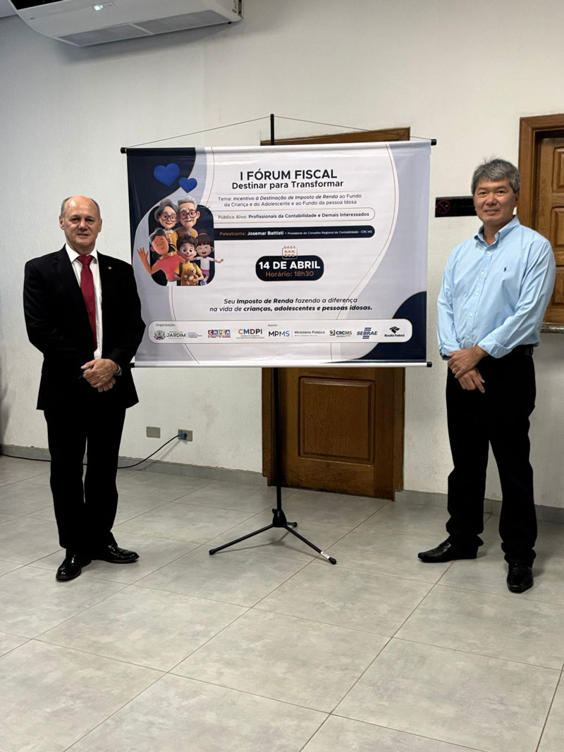 O Presidente do CRCMS – Conselho Regional de Contabilidade do MS, CT Josemar Battisti, o Vice-Presidente de Controle Interno, CT Joao Júlio Arashiro e a Coordenadora da Comissão Mulher Contabilista de MS – CRCMS Mulher, CT Lizandra Almeida de Menezes participaram do “I Fórum Fiscal – Destinar para Transformar” do município de Jardim, realizado no dia 14/04/26, com início às 18h30, no Centro de Convenções de Jardim/MS.