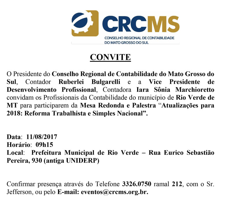Rio Verde: 11/08, 09h15 - Mesa Redonda e Palestra “Atualizações para 2018: Reforma Trabalhista e Simples Nacional”