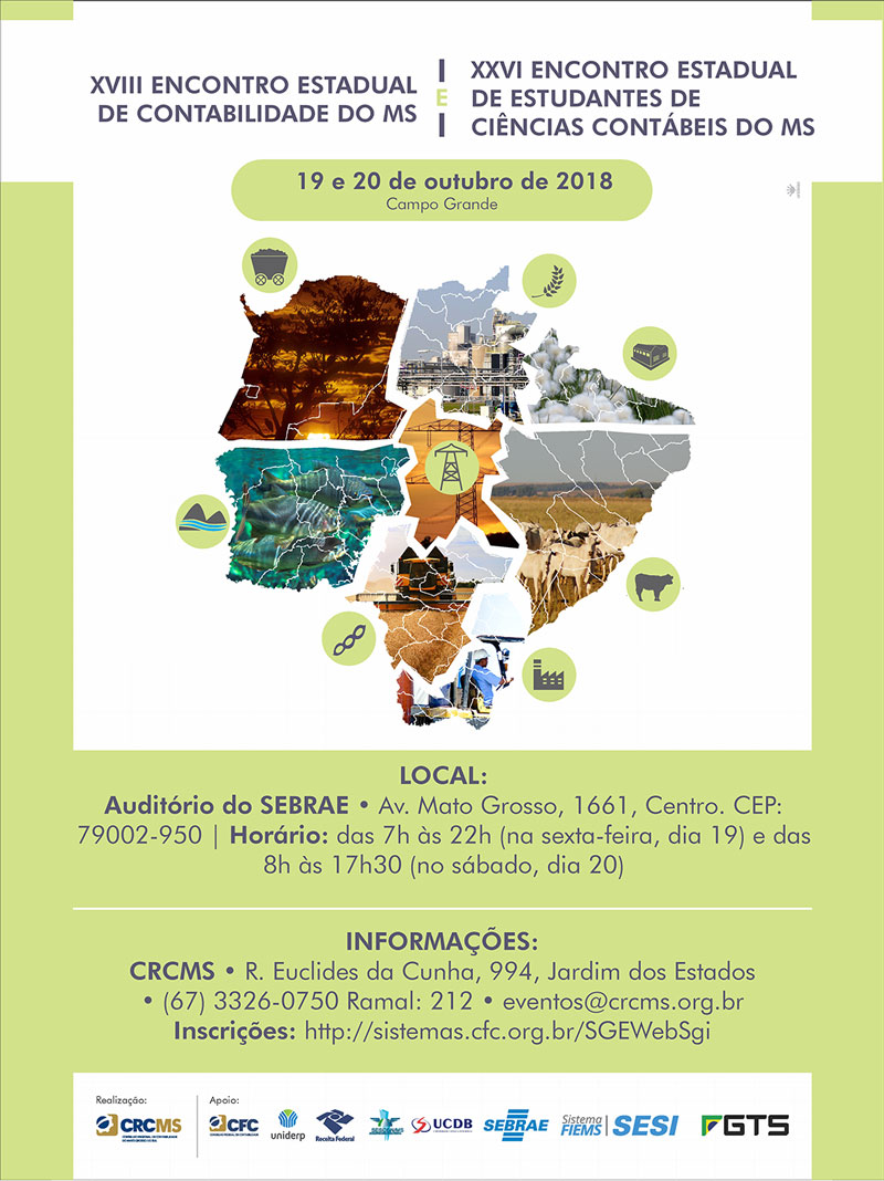 Com o lema “A Contabilidade Como Instrumento de Transparência”, o CRC/MS – Conselho Regional de Contabilidade do Mato Grosso do Sul realizará o “XVIII Encontro Estadual de Contabilidade do Mato Grosso do Sul” nos dias 19 e 20/10/18, no dia 19/10 – sexta feira das 7h30 às 21h e no dia 20/10 – sábado das 8h às 18h30, no Auditório do SEBRAE/MS – Av. Mato Grosso, 1661, Centro, em Campo Grande/MS e, além do evento principal serão realizados, simultaneamente, os eventos: